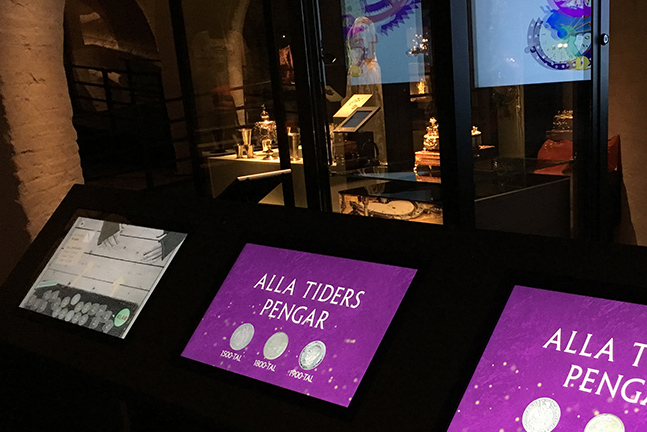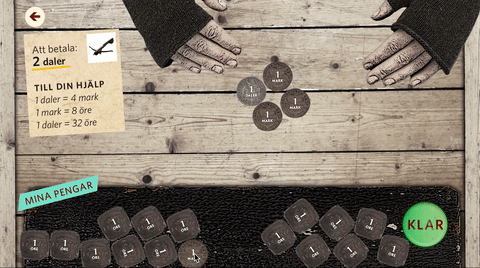 To communicate the main currency periods in Swedish history and the relation between their respective denominations, a game was designed for which I was responsible for the interaction design and development. It lets a visitor experience trading with e.g. 16th century currency, which can be quite a challenge compared to using the base 10 monetary system of today.
