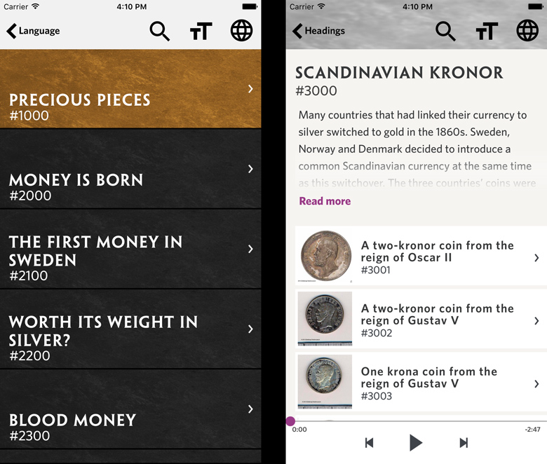 Interaction design and development of an app for mobile and tablet to make content available to visitors. Besides Swedish and English, guides in Swedish Sign Language and “easy Swedish†are also available for download from within the app. Objects are organised into groups, but can also be found by typing their numbers as seen in their respective showcases.